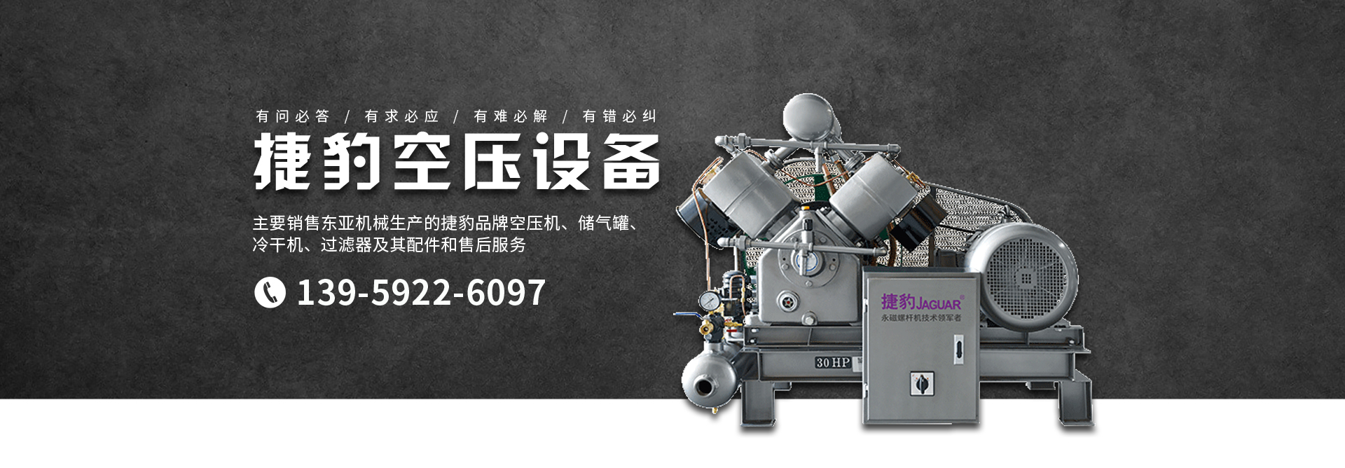 主要銷售東亞機(jī)械生產(chǎn)的捷豹品牌空壓機(jī)、儲氣罐、冷干機(jī)、過濾器及其配件和售后服務(wù)。